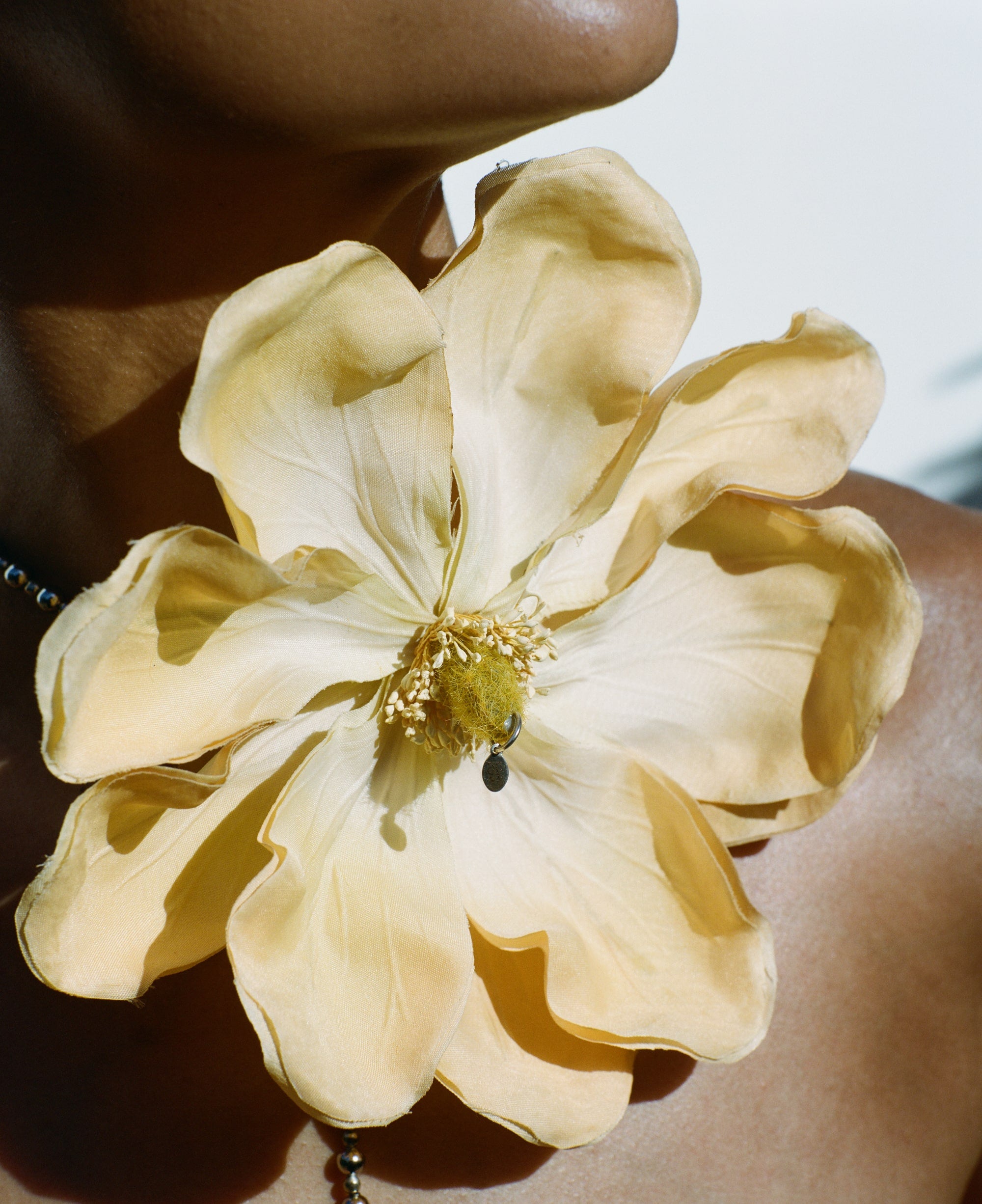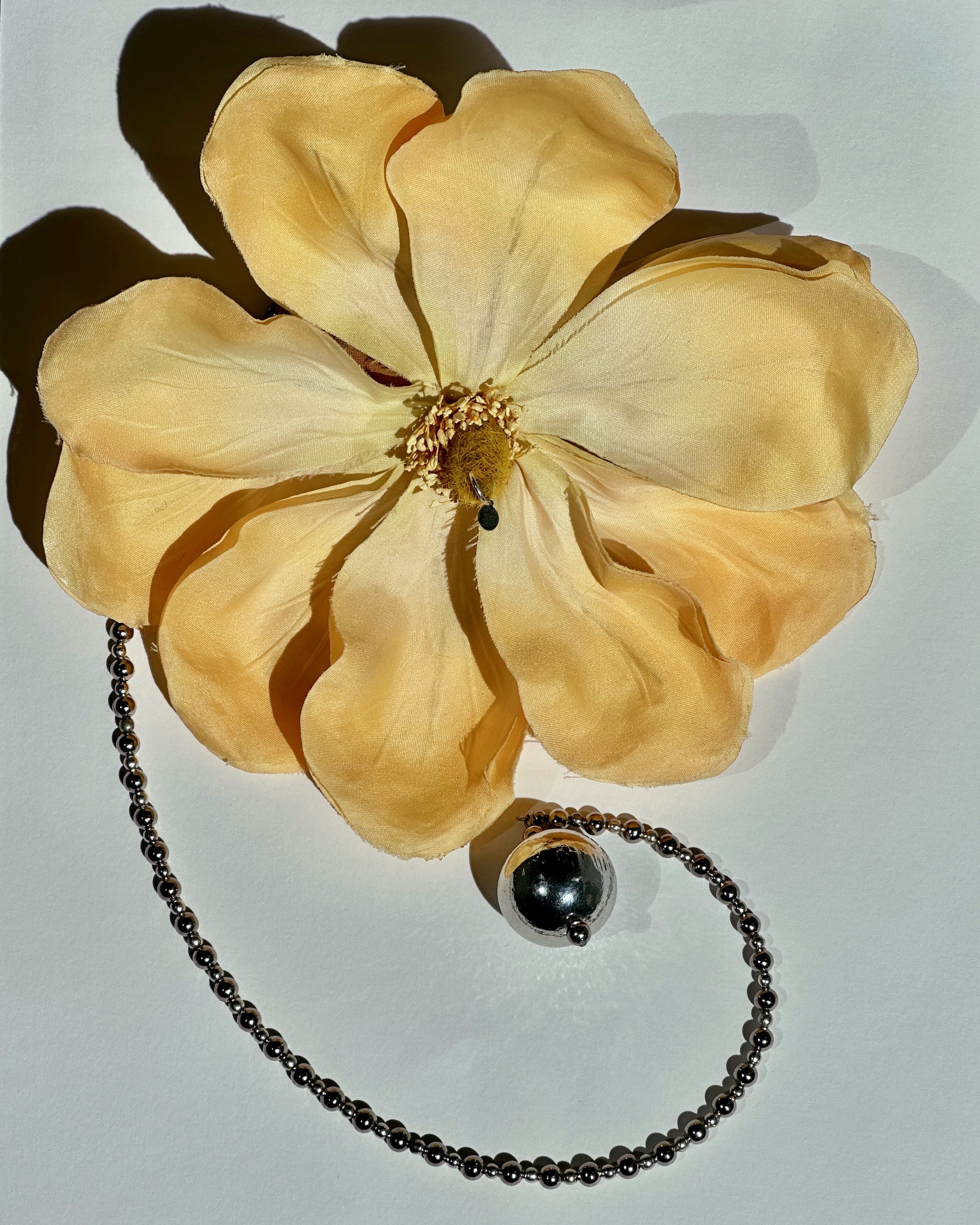 A single Vintage flower from is anchored with rhodium beads string and vintage wooden bead (26mm). This exquisite conversation starter has great range as it can be worn in many different ways. Adjustable to be worn as a choker or as a necklace. Vintage metallic rhodium beads (5mm) (3mm) and stainless steel lobster clasp.