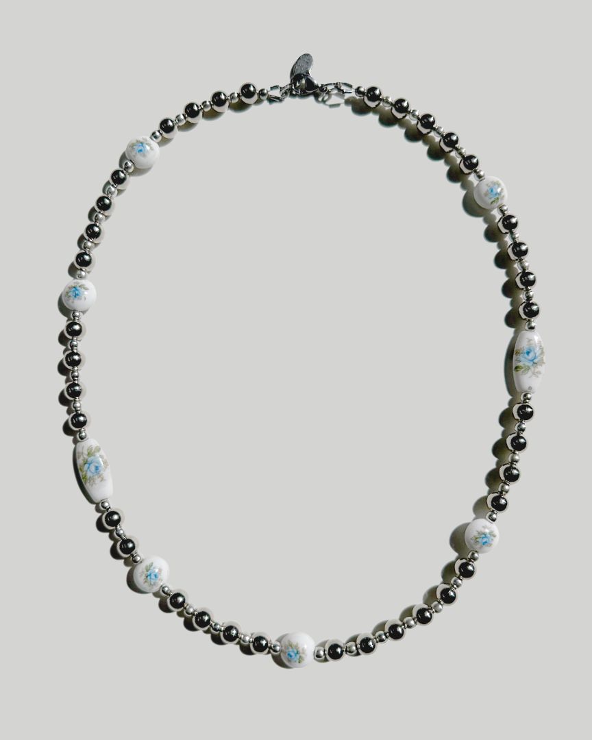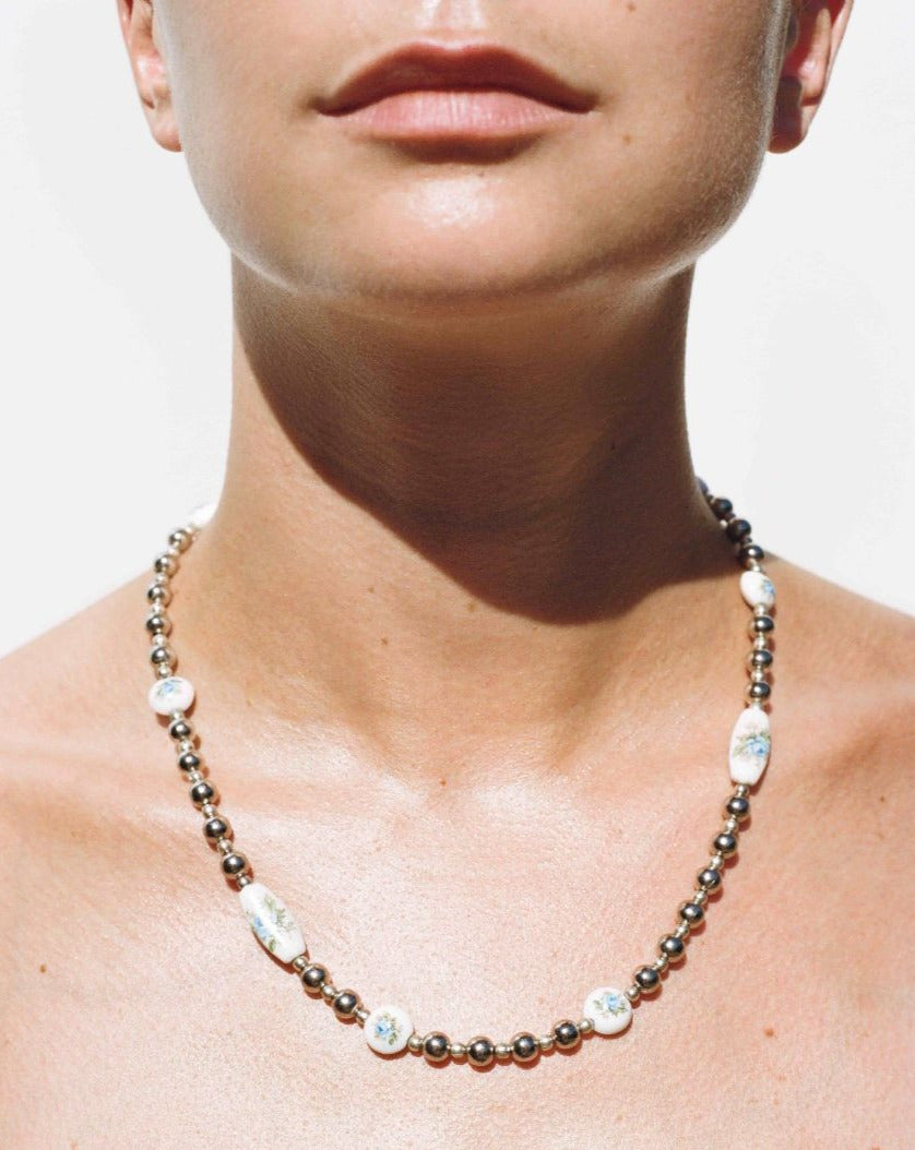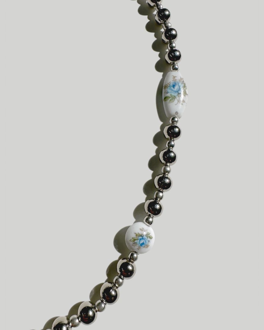 Another bold interpretation of the Jänkälä collection. The union of strength and delicacy mix beautifully as Vintage Japanese flower white ceramic beads (10mm) (9x19mm) vintage metallic rhodium beads (6mm) and metallic mini beads (3mm) come together in harmony.
