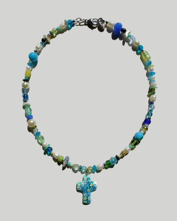 This one-of-a-kind piece includes; Cross Shaped Baby Blue Millefiori (30x22mm) glass beads, African beads, tiger eye, limestone, coconut shell, crystals, quartz, hematite, coral, seashell, genuine, freshwater, and faux pearls.