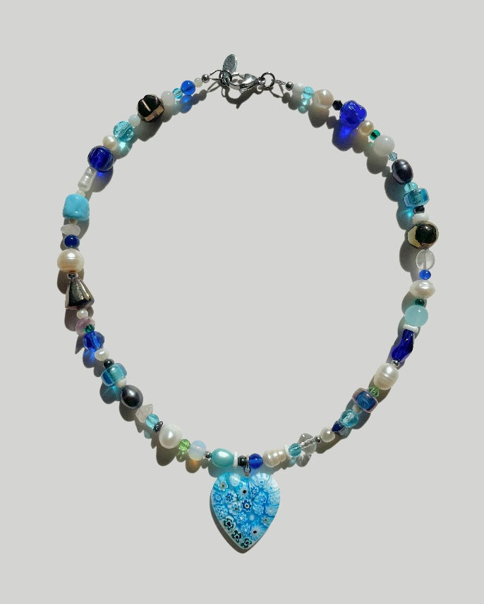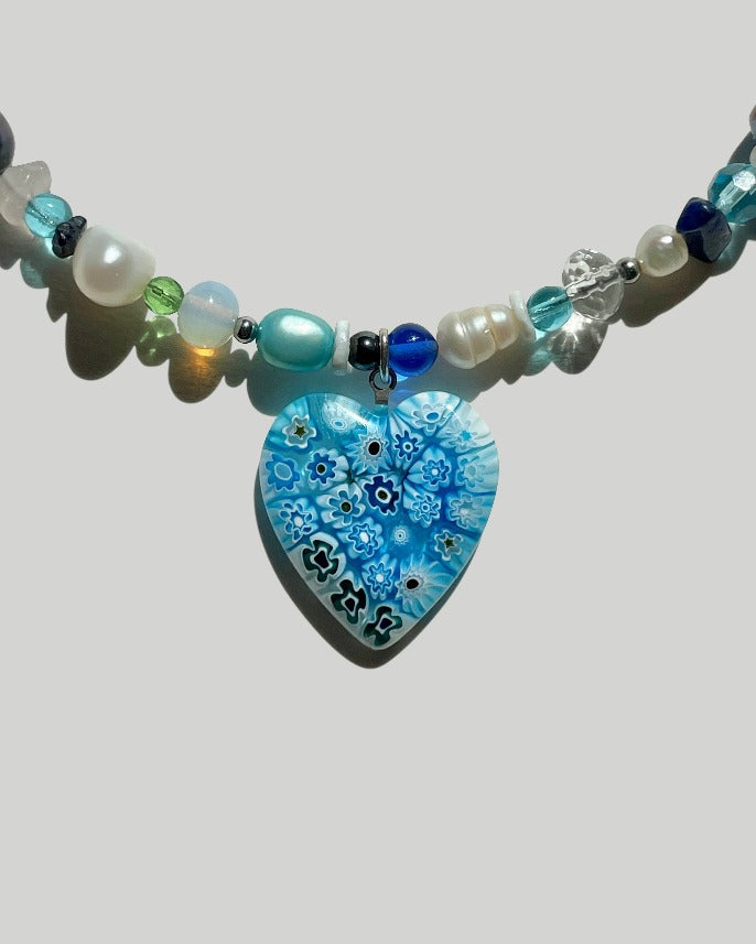 This one-of-a-kind piece includes; Heart Shaped Baby Blue Murano (25x25mm) glass beads, African beads, tiger eye, limestone, coconut shell, crystals, quartz, hematite, coral, seashell, genuine, freshwater, and faux pearls.