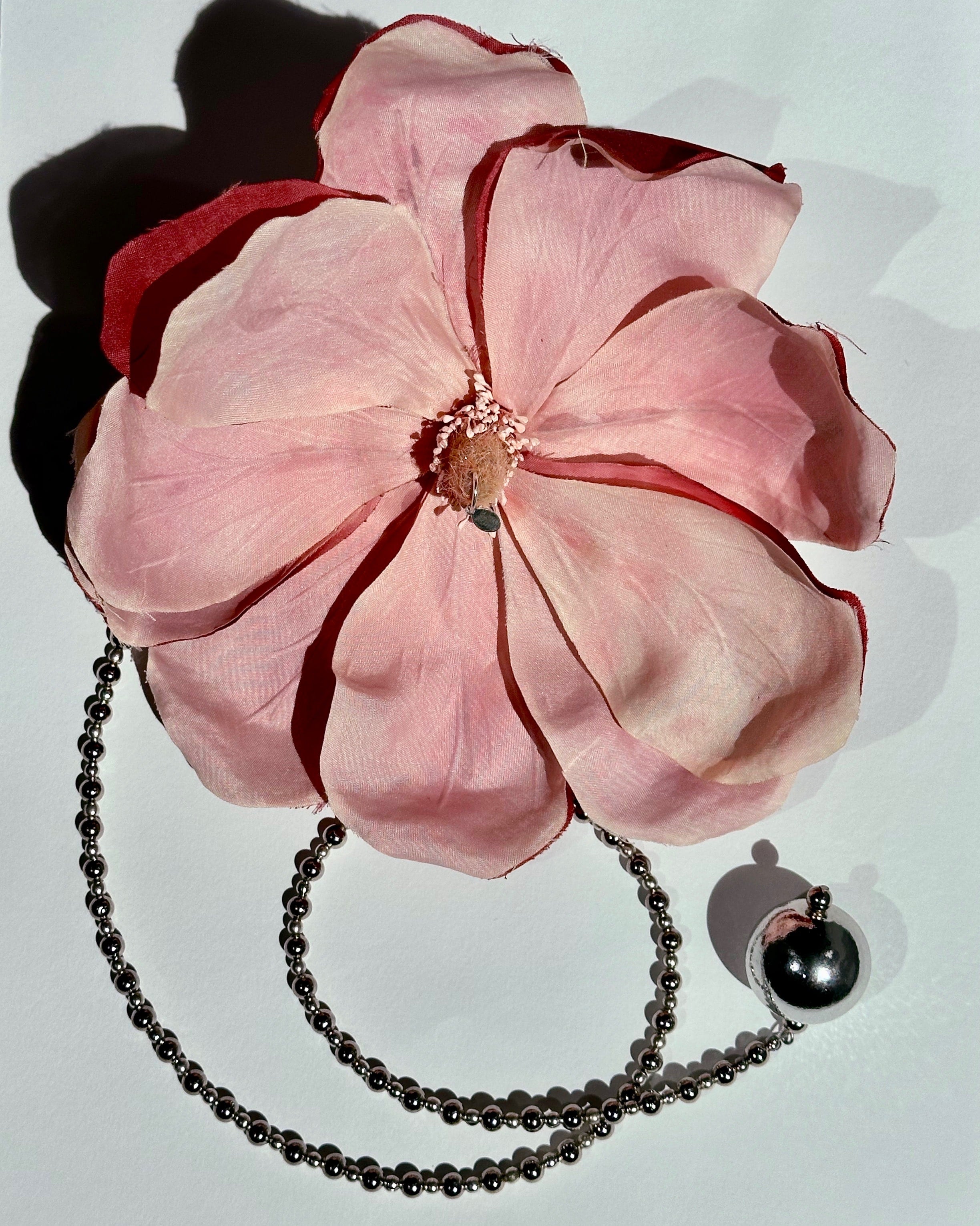 A single Vintage flower from is anchored with rhodium beads string and vintage wooden bead (26mm). This exquisite conversation starter has great range as it can be worn in many different ways. Adjustable to be worn as a choker or as a necklace. Vintage metallic rhodium beads (5mm) (3mm) and stainless steel lobster clasp.