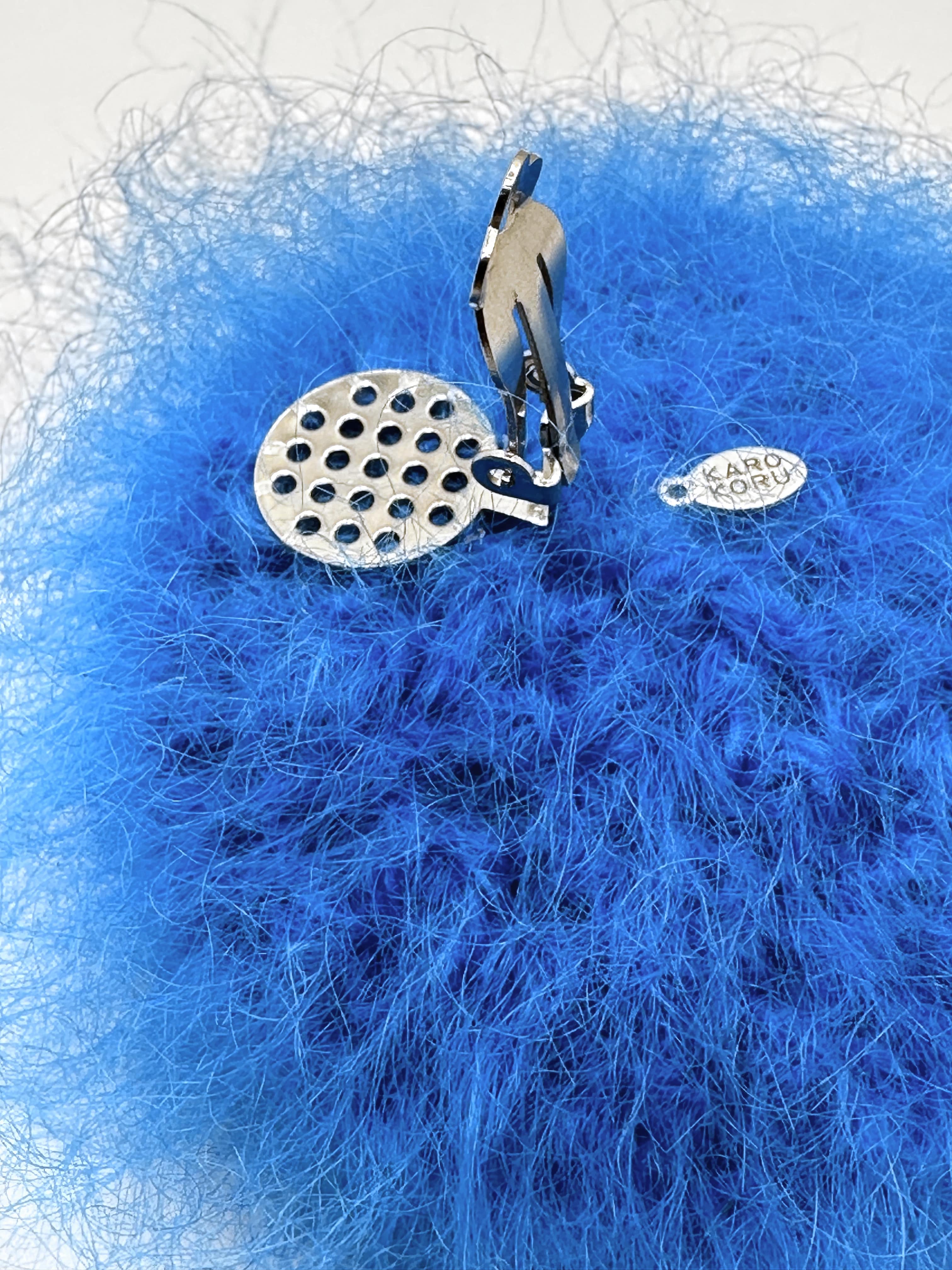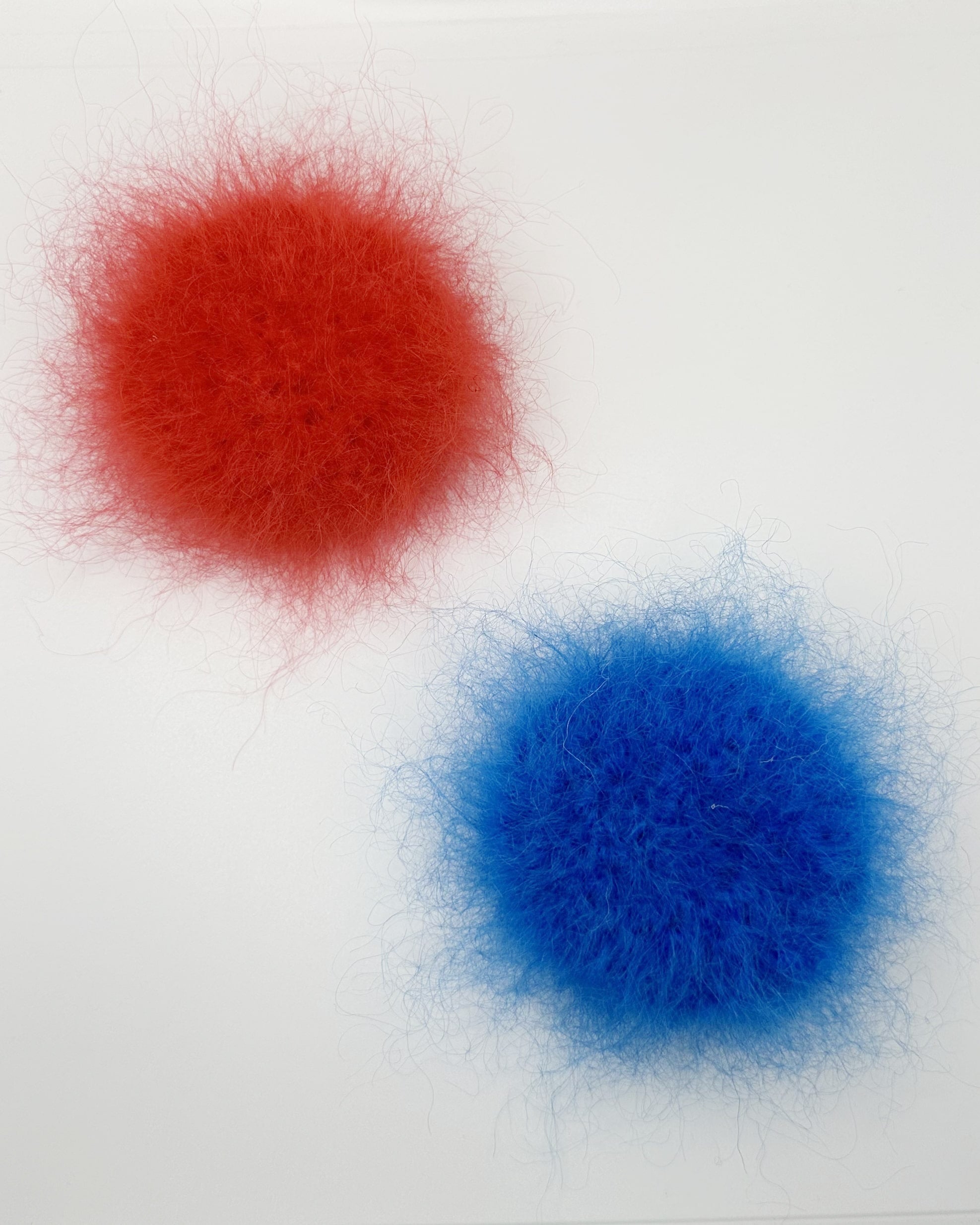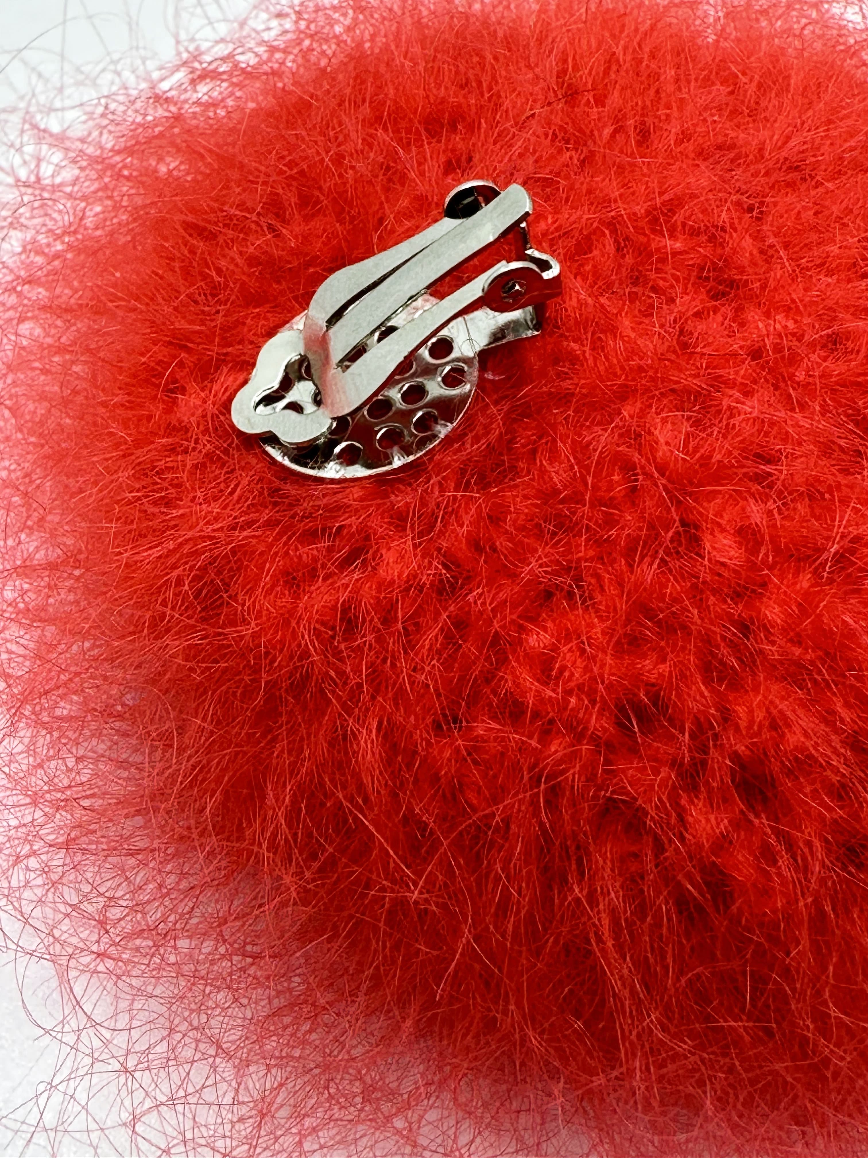 Bright blue and red crocheted vintage Mohair yarn filled with organic kapok fiber filling. Oblong in shape with stainless steel clip on backings. 3.5 inches in diameter.