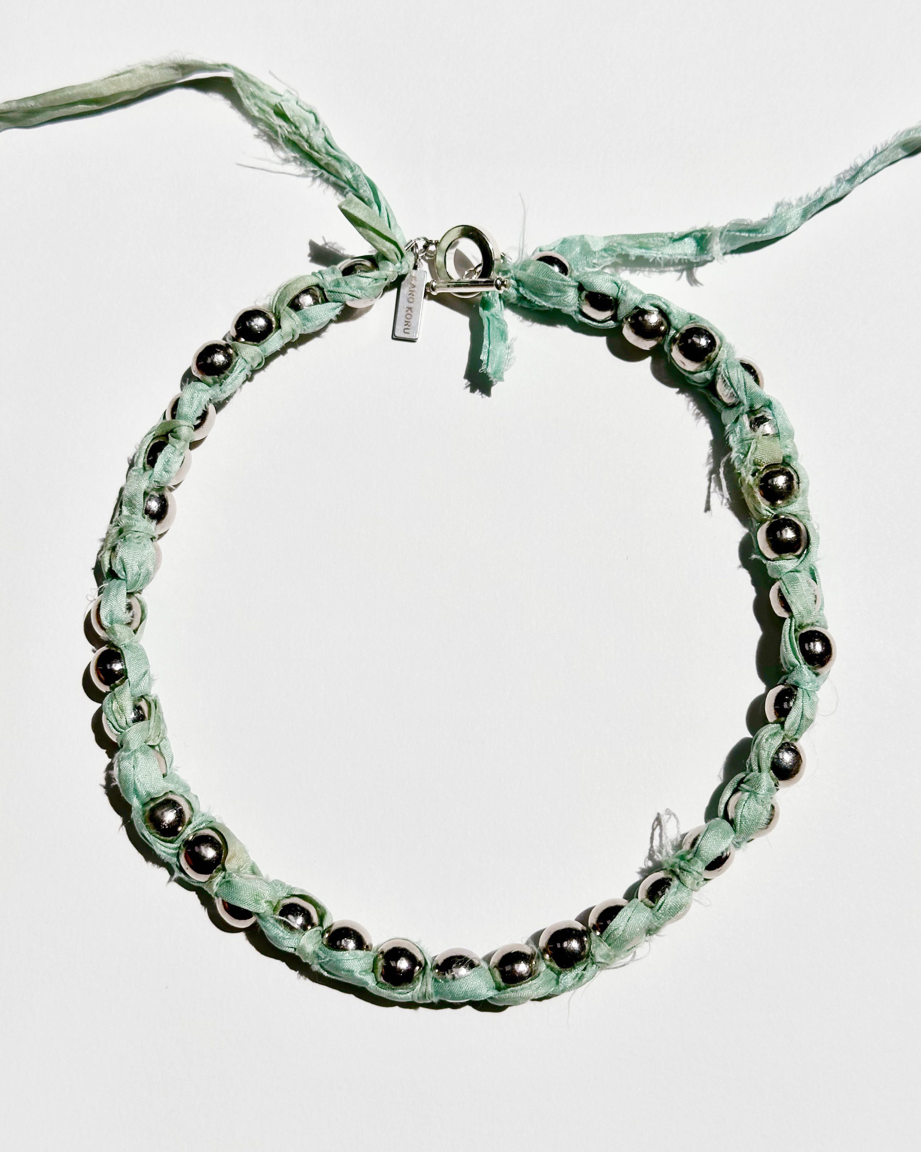 Vintage silk meets vintage metal beads in a playful customizable necklace. Shorten or lengthen through the clasp or ties to suit whatever the occasion. Soft color and a plethora of options to suit your mood. Toggle clasp is silver finished brass. Necklace length options are 20 inches or 17.5 inches. Also comes in Rubor, a blush color.
