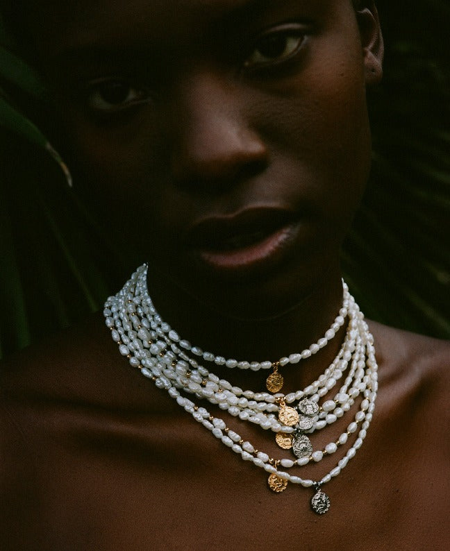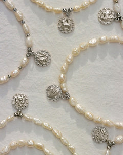 Karo Koru presents our limited edition, made-to-order Zodiac necklace collection. Vintage Zodiac necklace pendants from the '80s are born again, paired with a unique collection of upcycled vintage pearls and 14Kt gold-filled beads. Also available in Stainless Steel.