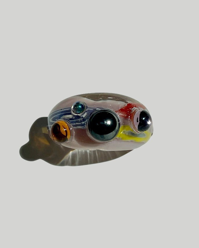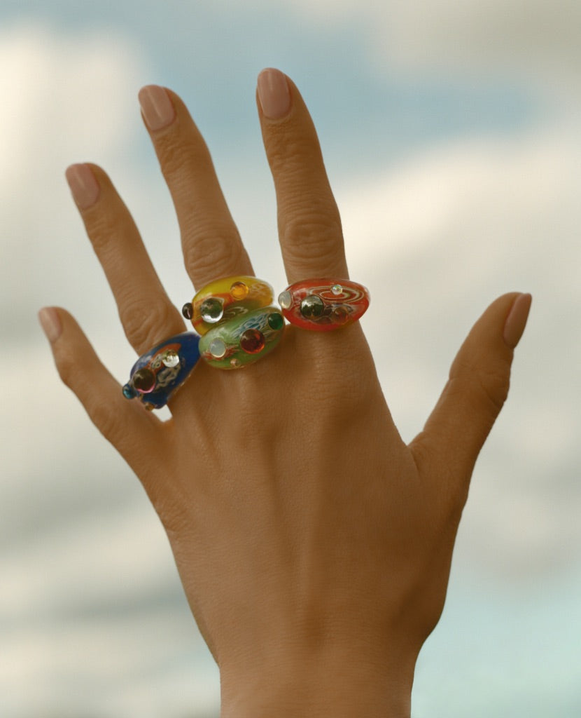 We discovered a treasure trove of Vintage Murano Style Glass Lamp Work Rings and artfully paired them with vintage glass cabochons to make a bold statement piece for any occasion.