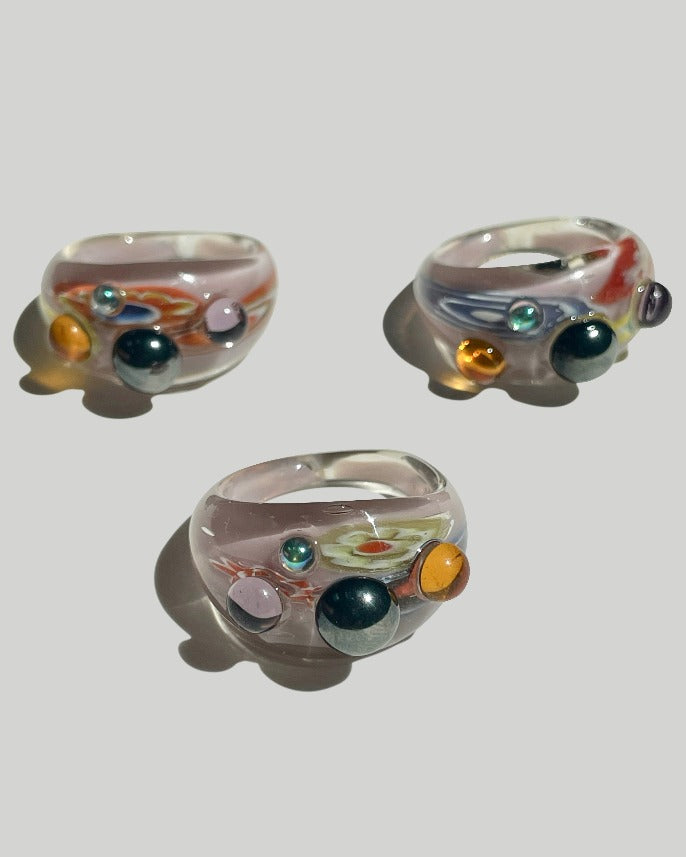 Every ring is one of a kind with a different background style. The base color is beige and the cabochons are always the same color.