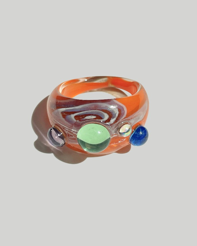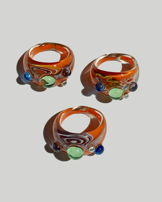 Every ring is one of a kind with a different background style. The base color is beige and the cabochons are always the same color.