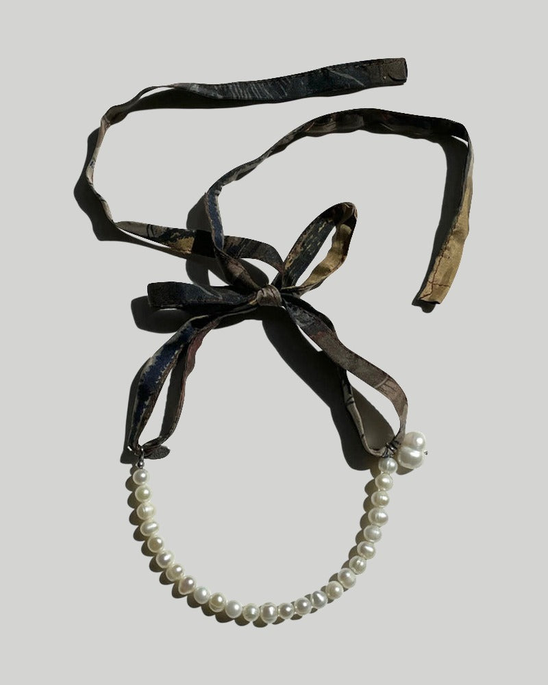 Vintage white pearl necklace with vintage ribbon tie pearls on a 7-inch stainless wire is fused to a 48-inch printed silk ribbon.
