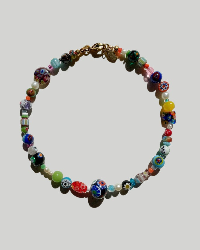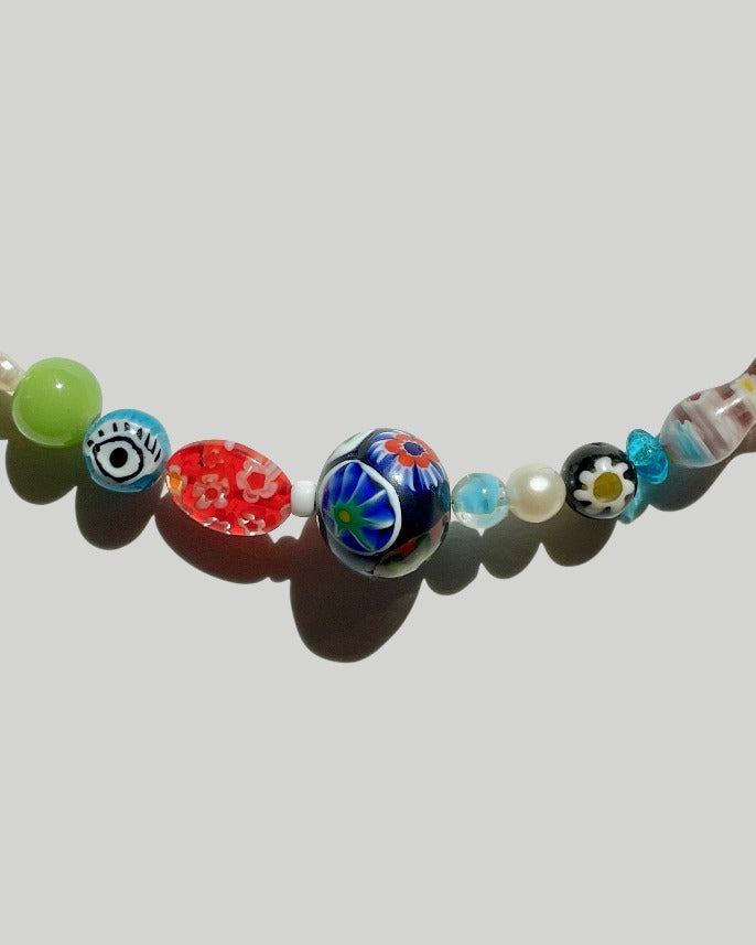 Vintage Black Murano bead mixed with vintage glass beads, millefiori beads, freshwater pearls, African beads, seashell, gemstones, and crystals.