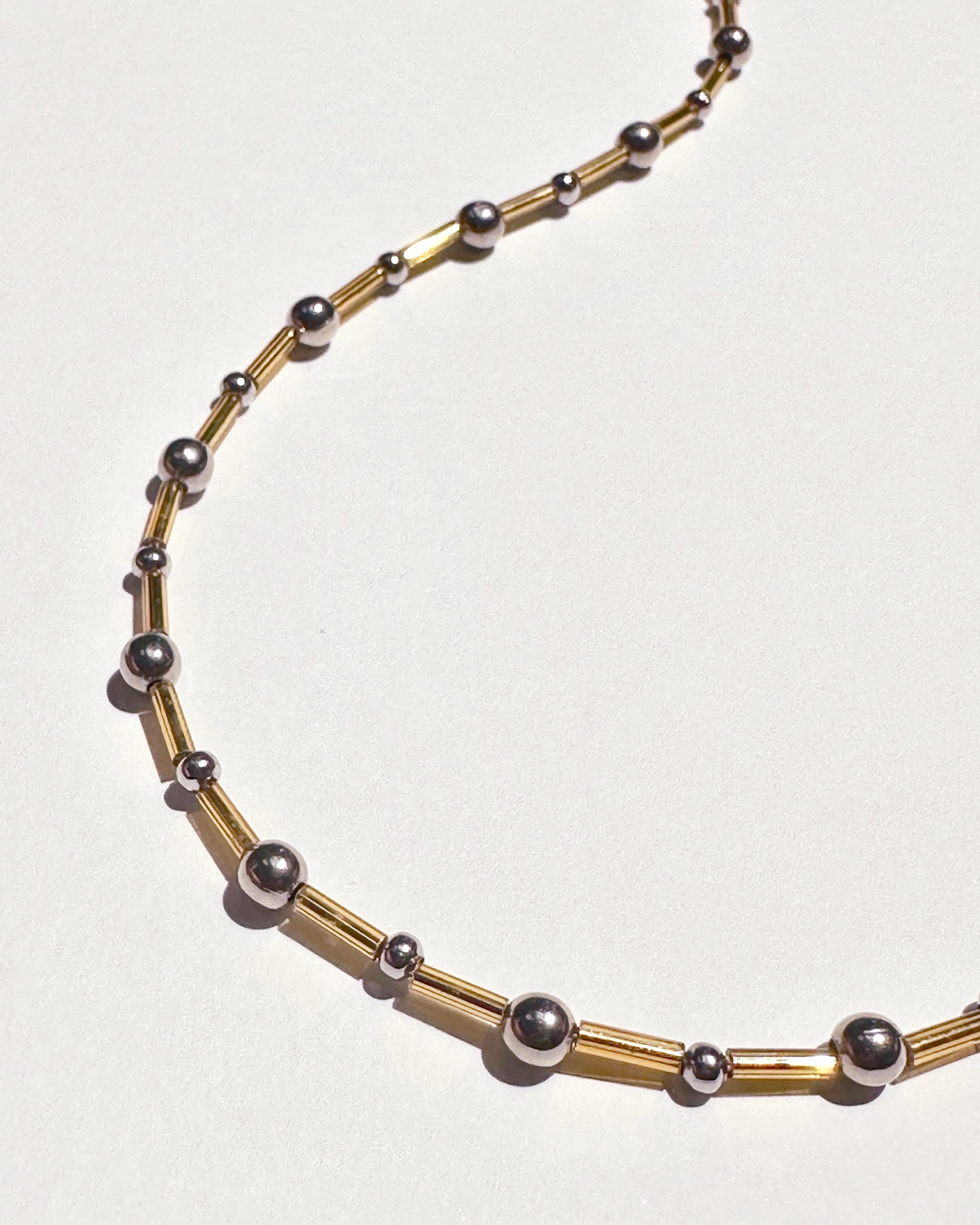 Vintage gold bugle beads with stainless steel beads for everyday wear. Necklace is 24 inches long and has stainless steel clasp.